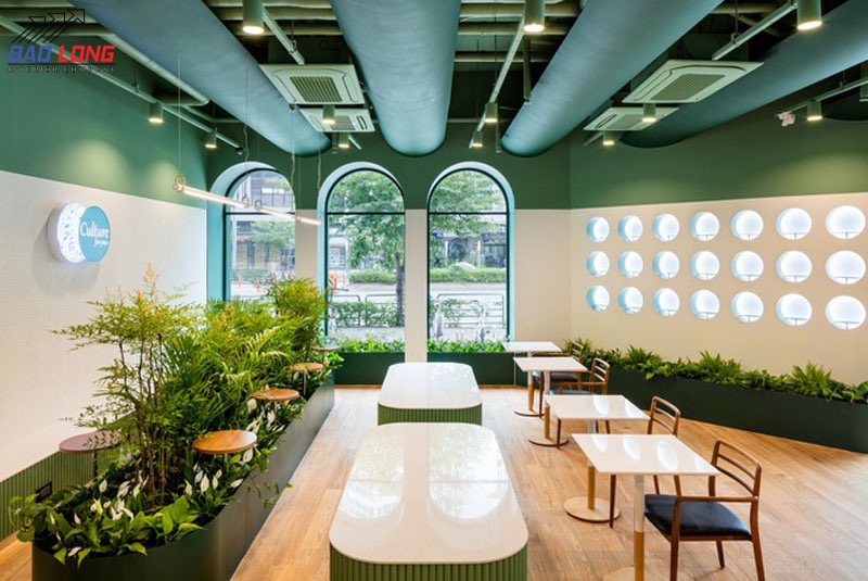 Phong cách Nhiệt đới, hay còn được gọi là Tropical Style, là sự kết hợp của màu sắc tươi sáng, thiết kế tự nhiên và yếu tố thiên nhiên, mang đến một không gian quán cafe sôi động và tươi mát. Đây là một phong cách thiết kế thú vị cho những người yêu thích không gian năng động và thú vị.